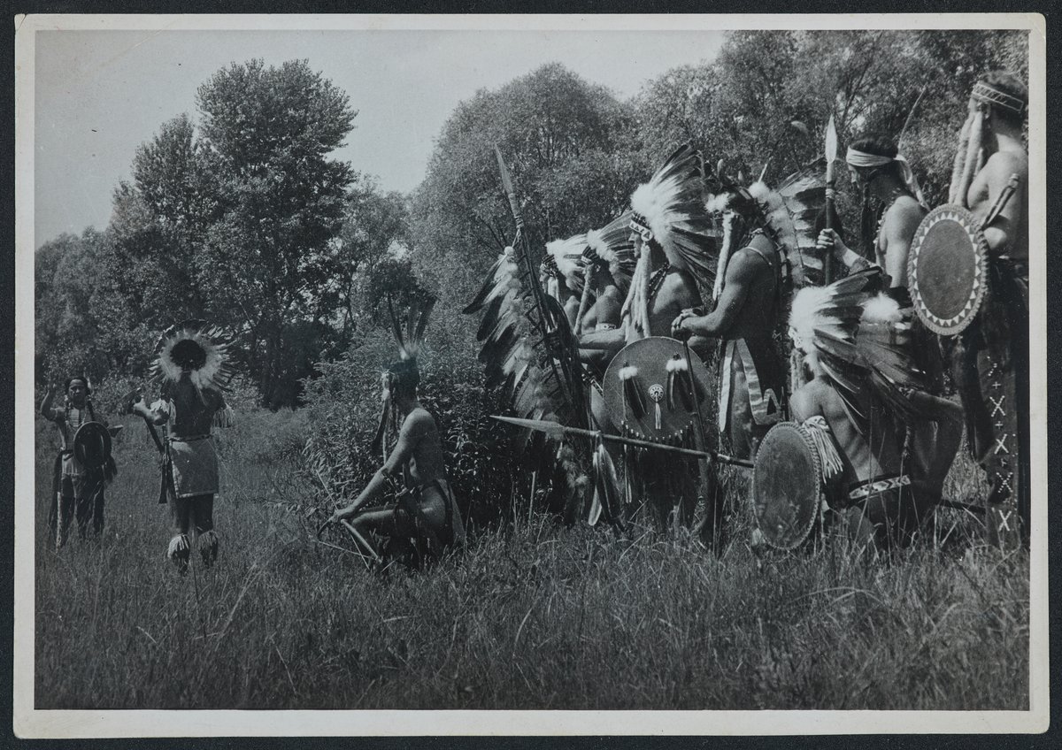 Meeting of Indians, welcoming ceremony scene in a ring of trees and bushes.