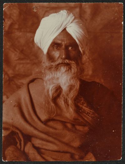 A piercing-eyed Indian man with a white turban, a long white beard, and an embroidered stole arranged in artistic folds on his shoulders. Slightly overexposed, dark brown image.
