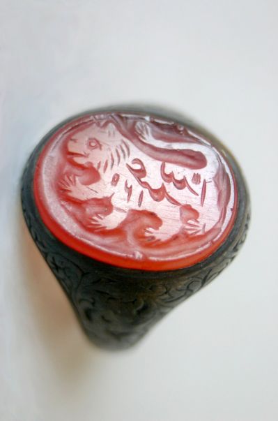 Carnelian cameo engraved. A name engraved in the relief-carved image of a lion