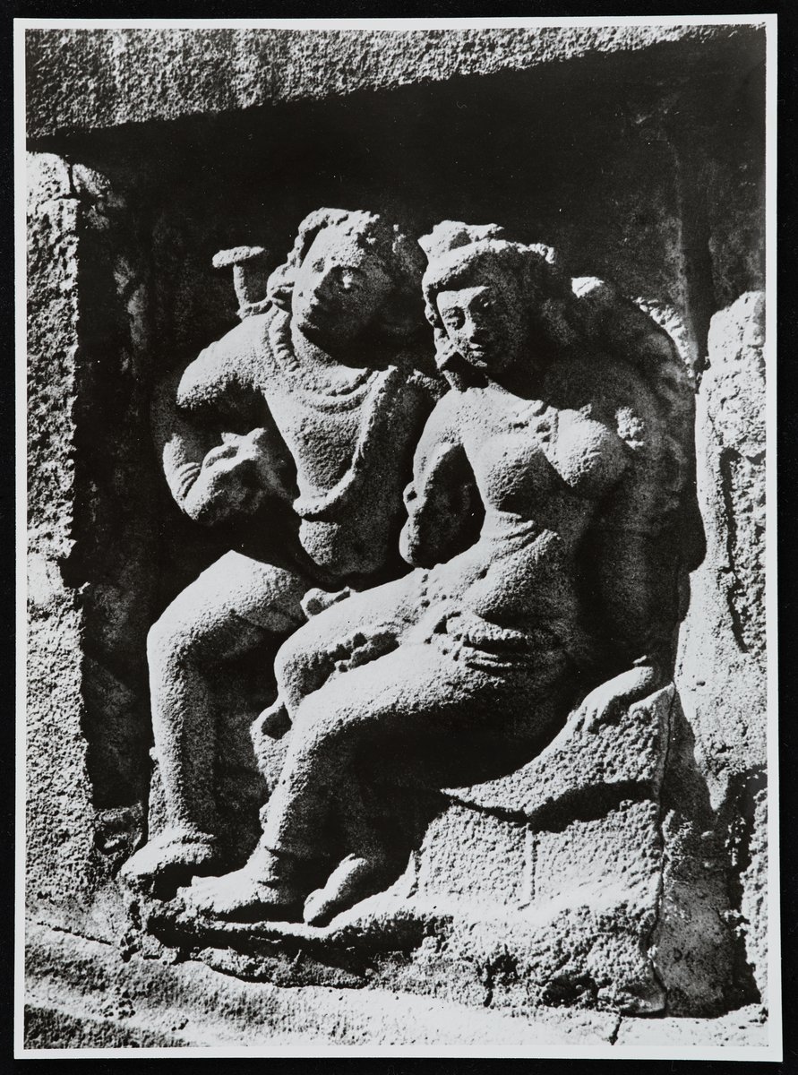 A detail of a statue or relief depicting a couple wearing jewelry carved into a niche in the wall.