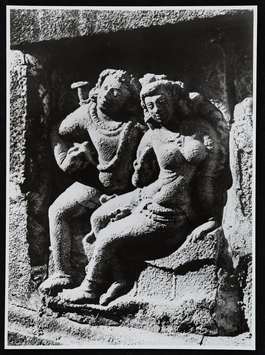 A detail of a statue or relief depicting a couple wearing jewelry carved into a niche in the wall.