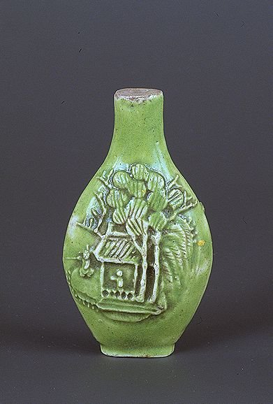 The flat, bottle-shaped body rests on a small, oval base and has a long, straight, cut neck. The base is also glazed; the stopper is missing.