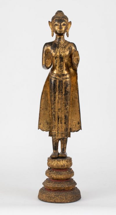 This gilt, slender, standing Buddha figure greets the viewer with his hands raised in the characteristic "Calming the Ocean" gesture (Skt. abhaya mudra). The three-tiered lotus pedestal narrowing from bottom to top was attached to the statue somewhat later, presumably from the 19th century.
