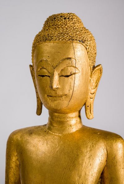 This gilded, slender, standing Buddha figure, with his right hand raised in the characteristic "ocean-calming-gesture" (Skt. abhaja-mudra), greets the viewer. Originally depicted with the same gesture, the complementary left hand is now broken off.