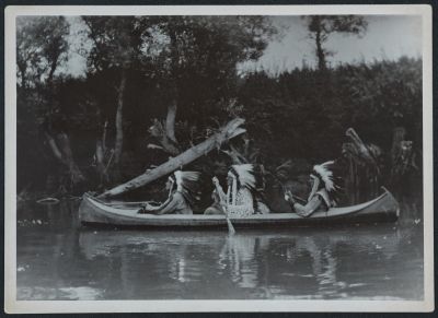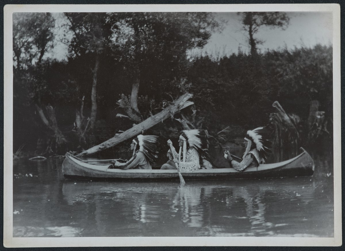 "White Owl" (Jr. István Básthy), "Laying Bison" (Ervin Baktay) and "Red Deer" (Sr. Áron Hegymegi Kiss) in a canoe, while hunting.