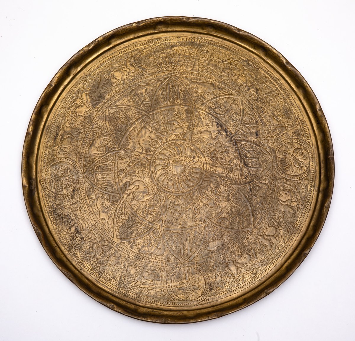 Representation of a rich scene in four circular fields, which can be divided into four parts. The division is provided by bending palm branches and flowering trees, with Kufic writing below them.