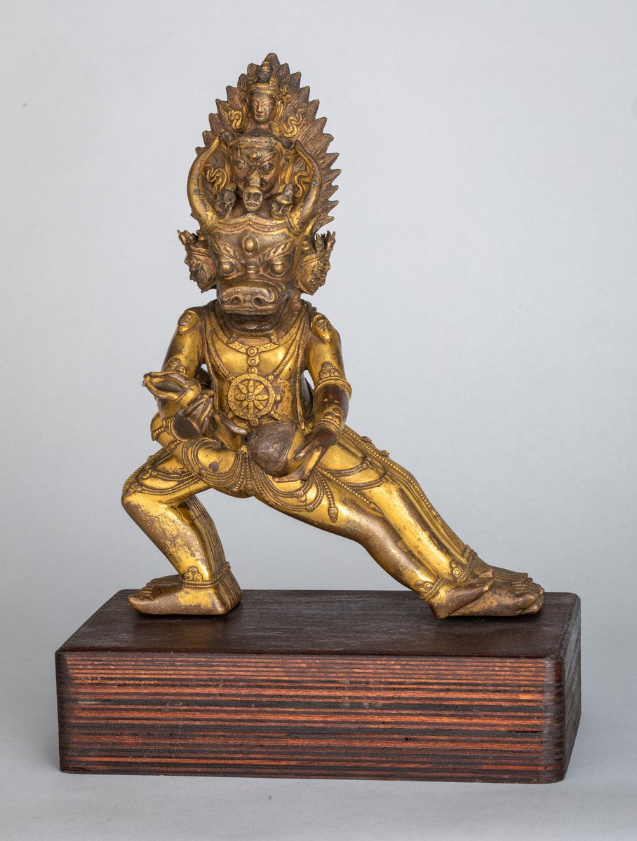 Vaijrabhairava dharmapala, the Gurdian of the Buddhist Doctrine and the Defender of the Faith with Fear-inspiring vajra stands in stepping out position with his eight pairs of legs. He has a buffalo head and six arms. Bracelets adorn his arms, anckles, ornements hangs from his hip, and eight-spokd prayer wheels decorate hos chest and back. Only his two main hands have survived with his main attributes. Above his shoulders also have two small haeds and between his horns are three small skulls, and a larger human head above then, and a smaller Manjusrí head on top. On its backside six small angry heads are depictied too. All the heads surrounded by flames and all foreheads have third eye. Vaijrabhairava embraces his consort in yab yum poition, to whom only two legs have remained intact, whilst her entire upper body is missing. The statue is a fragment, Vajrabhairava four arms, the secong head's skull diadem, the skul of the small head and the throne are all missing.