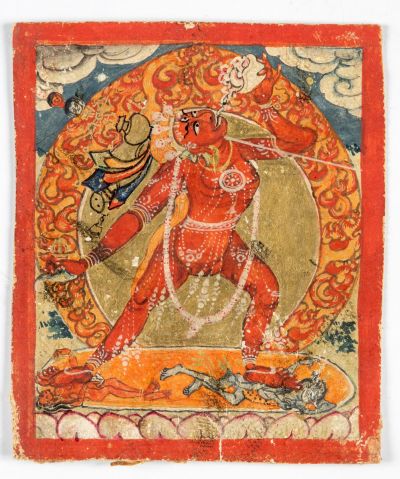 The cakli depicts the dakini Vajrayogini stepping on two human figures with the appropriate attributes. There is an inscription on its back.