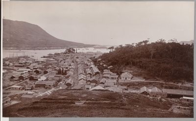 The album containing Dezső Bozóky's travelphotos (second). Related item: A.4760.2. (album). Unknown photographer. Photograph purchased by Dezső Bozóky. Panoramic view on two pages of the album, created from two photographs. “The regular streets of the new town gather around the attractive woody hill in the centre of the city. Shady stone steps lead to the Shinto temple on the top of the hill ... [from where] a captivating beautiful panorama of the whole city and the sea can be enjoyed. The streets of Busan are wide and straight, without exception, and intersect at right angles, as in modern American cities” (Bozóky 1911, I. 527−528).