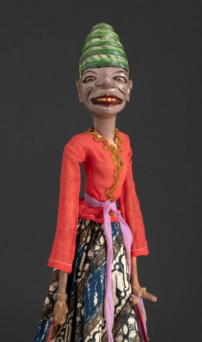 Wayang golek purwa puppet from Ernő Zboray's Collection. The puppet wears a turban-like headdress, typical of wise, elderly characters, a closed overcoat with ornate trim and a batik sarong decorated with typical Javanese "parang" and "kawung" (wave and coconut palm) motifs. The rod puppet was probably repainted at the end of the 20's