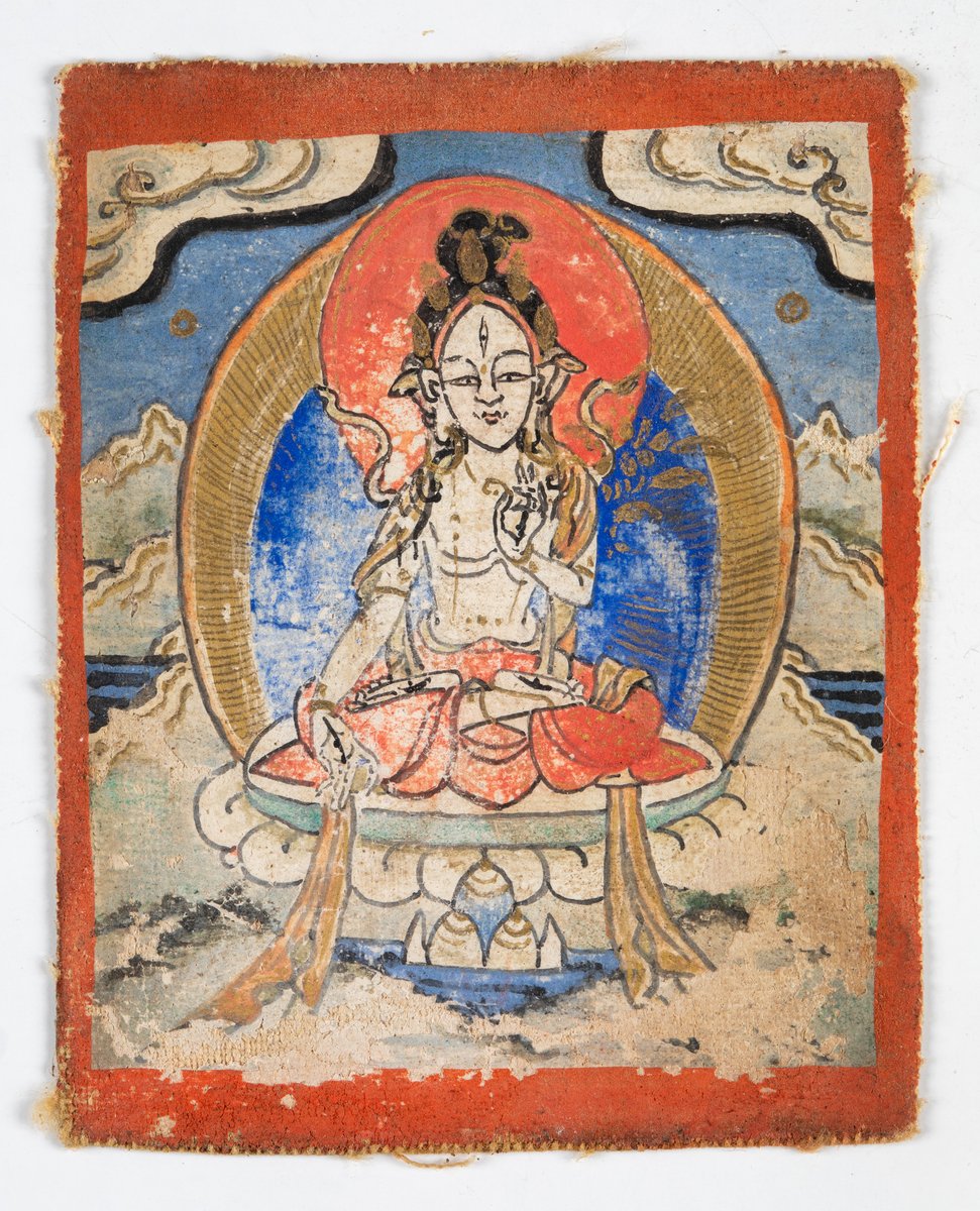 The figure of White Tārā is painted in bright colors on the red-framed caklin, surrounded by landscape (clouds, mountains). On the back is written Om A Hum in red in.