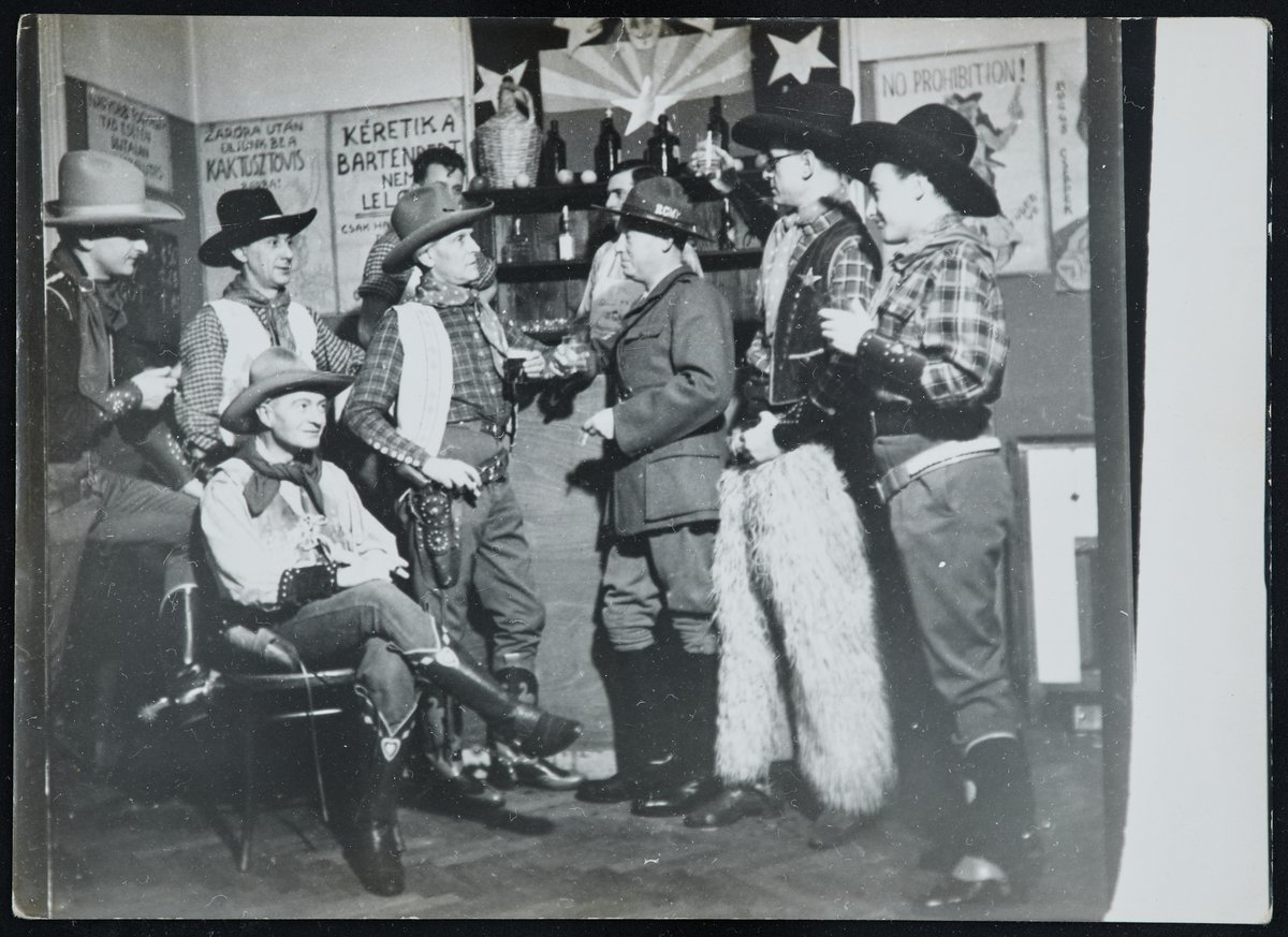 Wild West Zree Meeting, cowboy scene in the middle is Baktay Sheriff and Dr. Román Frohner is sitting next to him. On Agfa Brovira photo paper.