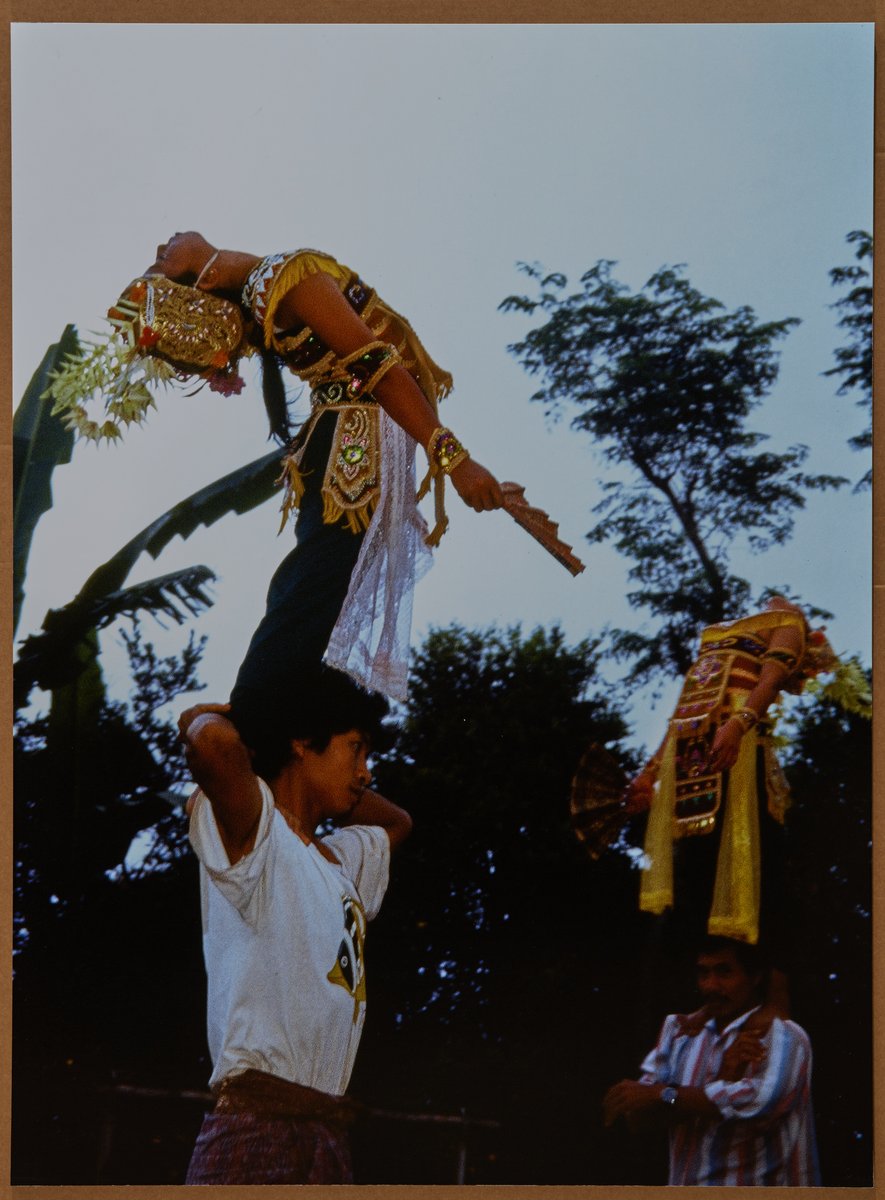Girls in trance, eyes closed, bend backward to face the sky. Reproduction by Gill Marais.