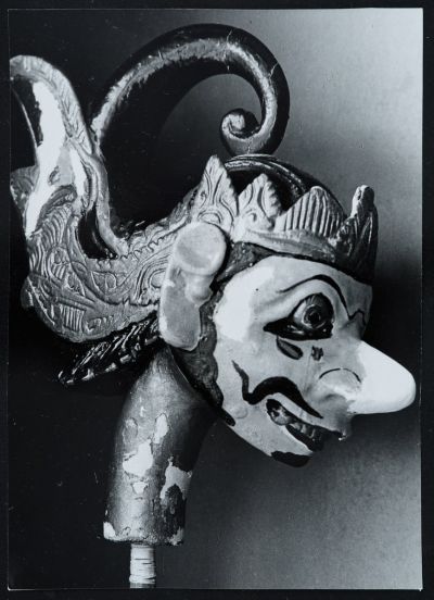 Photo of the head of the Wayang Golek warrior figure (inv. no. 66.50) from the collection of Ernő Zboray during restoration. The photo shows the condition during the restoration. The face of the puppet can be seen from the profile on the right, and the lack of paint and white foundation can be clearly seen on its face, nose, neck and headdress.