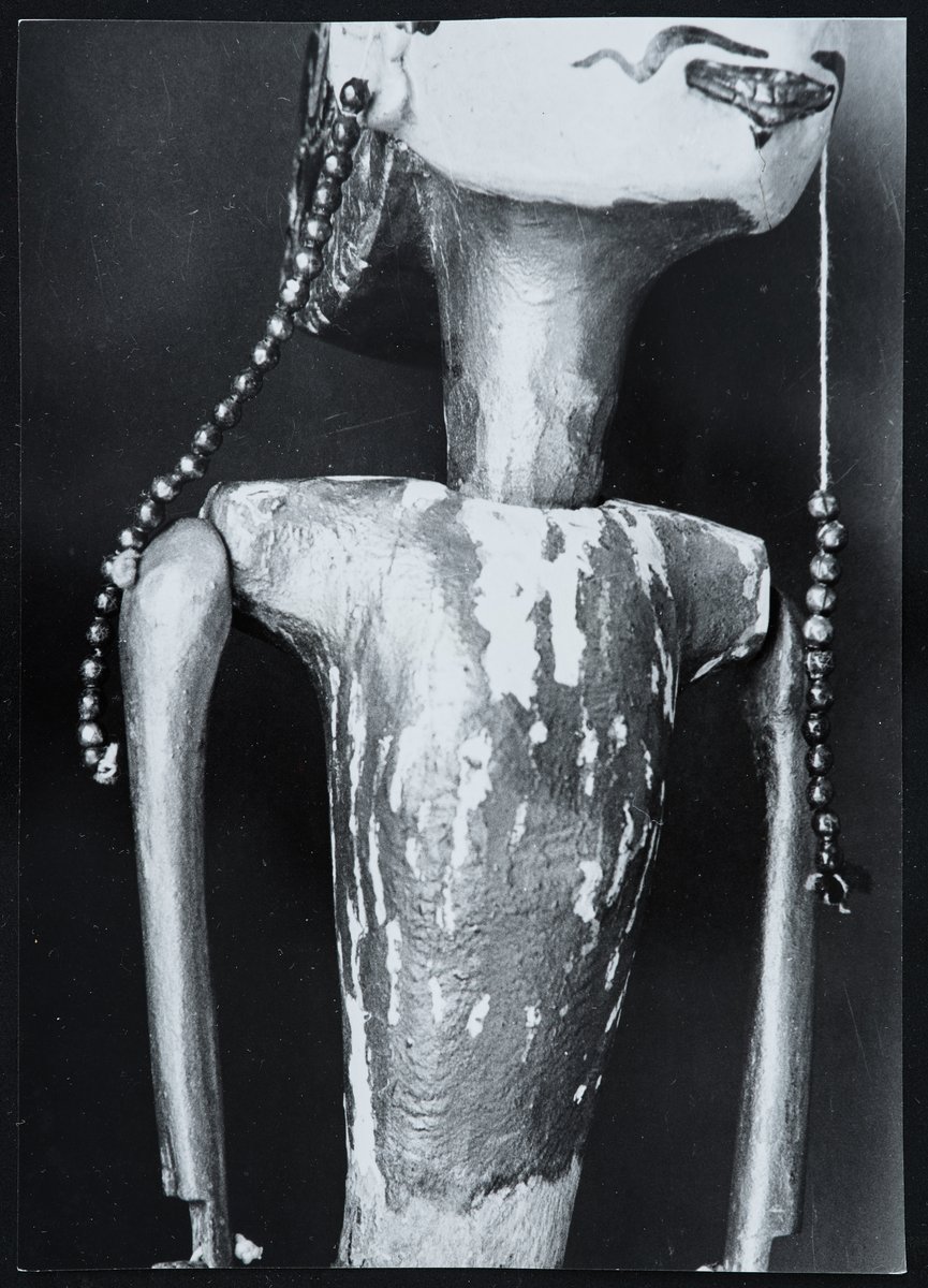 Photo of the body, neck and lower band of the head of the wayang golek warrior figure (inv. no. 66.50) from the collection of Ernő Zboray during restoration. The photo shows the state of the restoration. On the body of the puppet, the lack of paint and its priming can be clearly seen during the restoration.