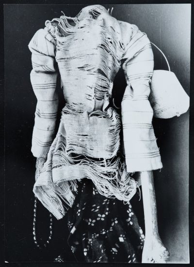 Photo of the figure of the wayang golek from the collection of Ernő Zboray (inv. no. 66.76) during restoration. The photo shows the body of the puppet from the back, in a state before the textile restoration, where the torn coat worn on the upper body of the puppet is clearly visible.