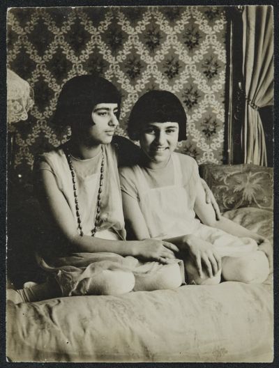 Két kislány blúzba öltözve a kanapén ül.