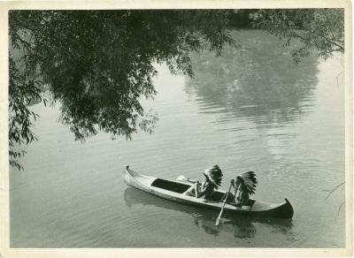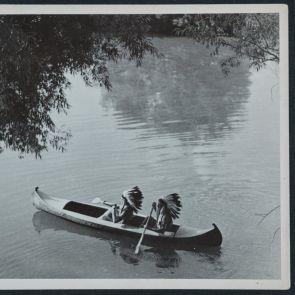 Baktay Ervin és Huszár Károly eveznek [ Kelényi Béla meghatározása ]. A folyóra ráhajlik a parti fák lombja, a túlparti fák tükröződnek a fodrozódó vízben.