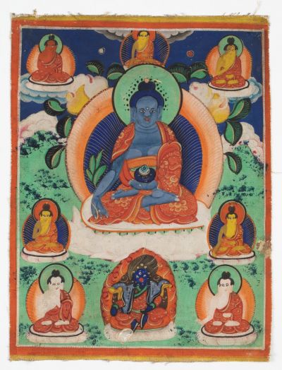 Középen a kék testszínű Bhaisadzsjaguru lótuszülésben ül, jobb kezében faágat, bal kezében nektárt tartalmazó tálat tart. Körülötte a többi Gyógyító Buddha, előtte egy kék testszínű haragvó istenség, valoszínűleg Mahákála egyik alakja.