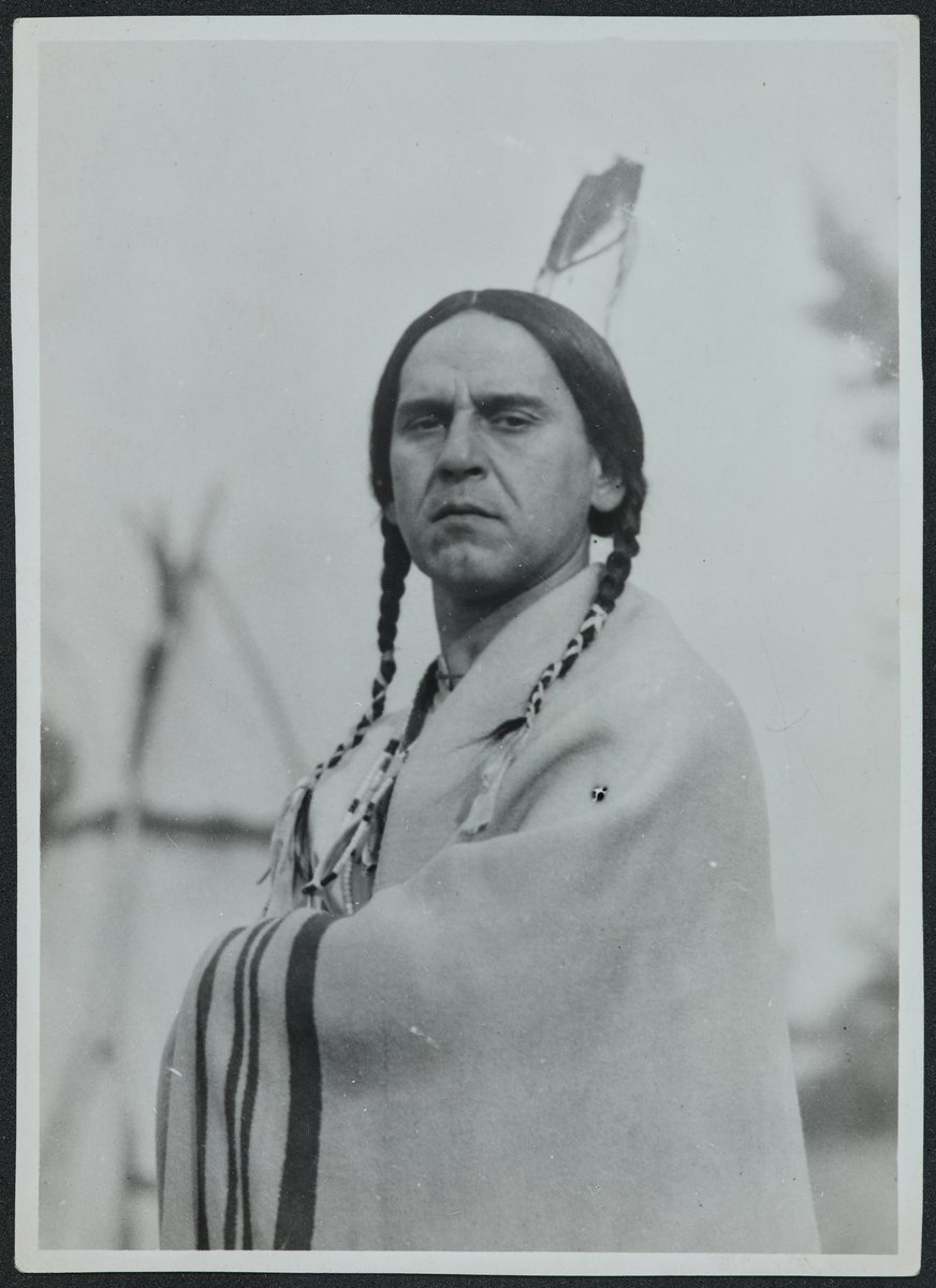 Copfos férfi, hajában egy szál tollal, vállán takaró, kissé lefelé néz a kamerába, a háttérben egy tipi homályos körvonalai látszanak.