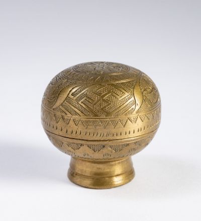 Bételkészlet tágabb tárgyegyüttesének részét képező, bételfogyasztáskor az ajkak védelmére használt ajakír (méhviasz vagy egyéb anyag) tartó, sárgarézből, virág és szvasztika (banji) motívumokkal.