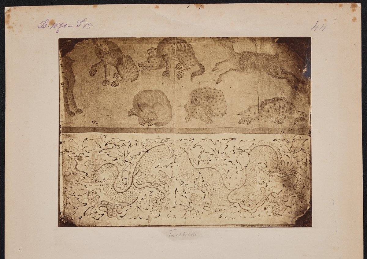 Albumlap a Topkapi Szeráj Múzeum (Topkapı Sarayı) könyvtárából, két sárkány madárfészket fosztogat, vázlat papírra, ecsettel, 15−16. század