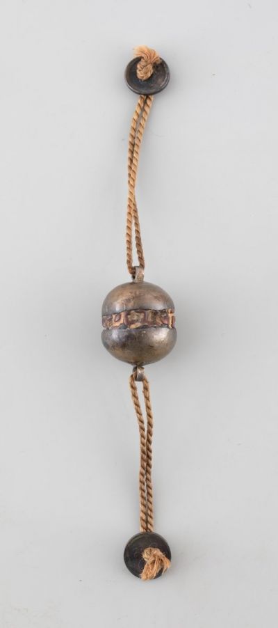 Anyag/technika: ezüst, csonthéjas mag, selyem