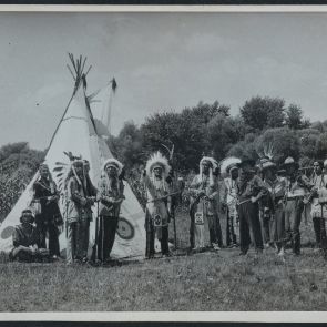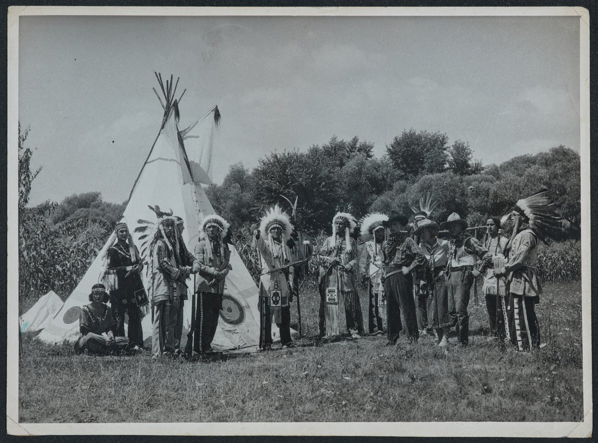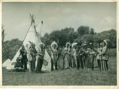 Az indián törzs, teljes díszben sorakozik az egyik tipi előtt. Jobb szélen két hölgy, az egyik a földön ül, a Főnök középen áll, előre mutat. A kép jobb oldalán három cowboy is áll.
