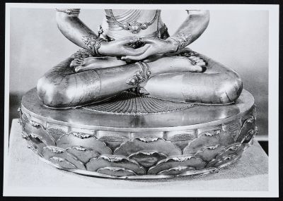 Az ulánbátori Szépművészeti Múzeum gyűjteményében szereplő Amitábha szobor (Dzanabadzar alkotása) lótusztrónja. Forrás : Cültem, N., Vüdajuscsijszja mongolszkij szkulptor G. Dzanabadzar. Ulan-Bator 1982. 26. sz. ill. részlete. (Részletfotó.) Publikációból kifotózott fekete-fehér fotó, amelyen meditációs pózban és kéztartásban ülő, felékszerezett istenség lótusztrónusa látható.