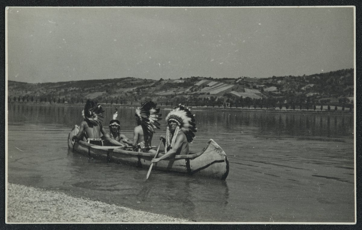 Négy fejdíszes, meztelen felsőtestű férfi evez a parti homok közelében.