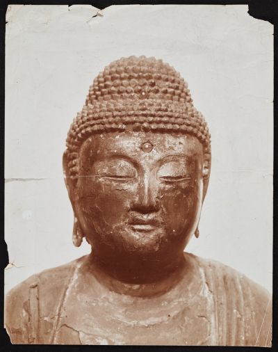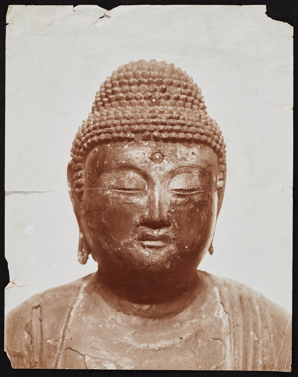 A fotón Buddha szobor feje látható, kisebb apró sérülésekkel.