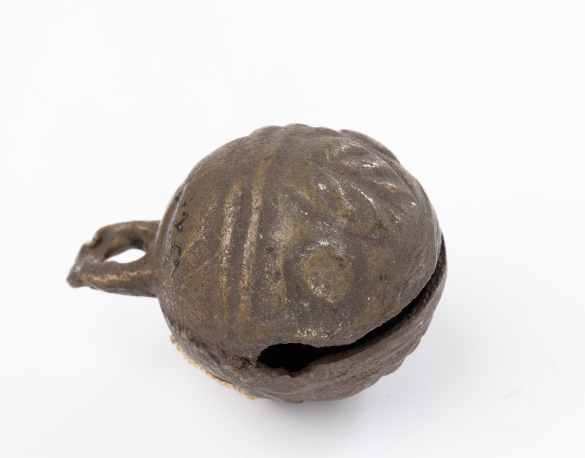 Bronz csörgő, testén vonalas és háromszöges díszítéssel, szájánál levélmotívum.