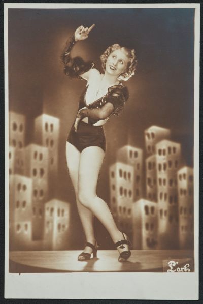 Szőke hölgy sötét színű kis nadrágban, buggyos ujjú felsőrészben, jobb kezével fölfelé mutat, mögötte árnyképes kulissza, felhőkarcolókkal.