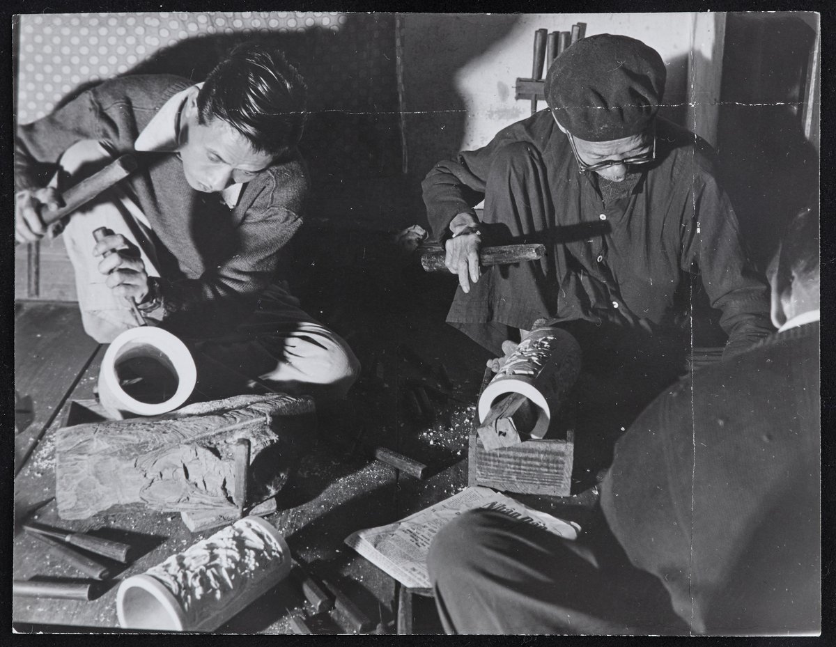 A képen két férfi (és egy férfi háttal) a földön ülve elefántagyarból faragnak hengeres dísztárgyakat. Előttük a földön vietnámi nyelvű újság hever. Rév Miklós fotóművész 1959-ben fényképezett Észak-Vietnámban, az akkori Vietnámi Demokratikus Köztársaságban. Patkó Imre újságíróval közös útjáról 1960-ban "Vietnam" címen megjelent kötetükben tudósítottak. (ld. F. 2025.39.11)