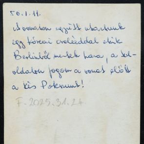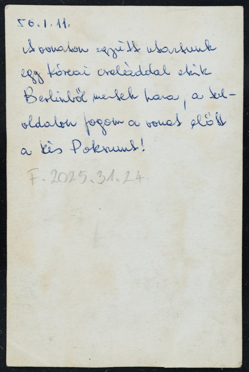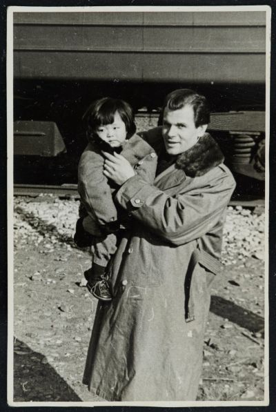 Életkép: Klein István koreai kisgyermekkel a kezében, egy vonat előtt állva