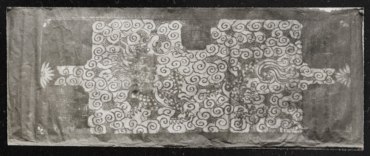 Fekete-fehér fénykép feliratos tekercsképről. Stilizált felhőmotívumok között mitikus állat alakja rajzolódik ki, két, kilencszirmú virágkehely között.