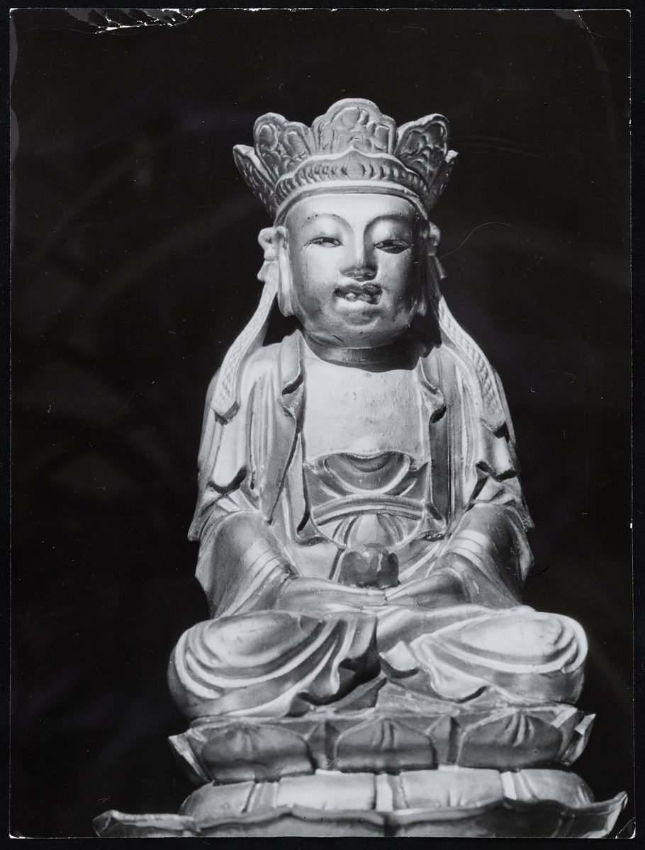 Fekete-fehér fénykép lótusztrónuson ülő, koronás Buddhát ábrázoló vietnámi szoborról. Hasonló képek: Patkó Imre - Rév Miklós: Vietnam művészete. Budapest, Corvina Kiadó, 1967.