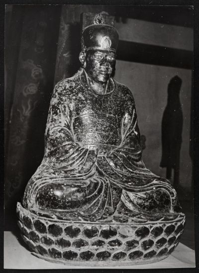 Fekete-fehér fénykép ülő alakot megjelenítő faszoborról, lótusztrónuson, bajusszal és redőzött köpennyel ábrázolva. (Le loi ?) A fénykép templomi környezetben készült. Hasonló képek: Patkó Imre - Rév Miklós: Vietnam művészete. Budapest, Corvina Kiadó, 1967.