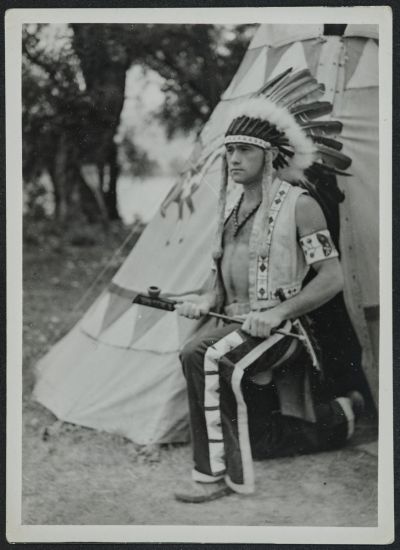 Sokkutya, más néven Fekete víz (Gottesman Ernő) fél térden állva egy tipi bejáratánál, nagy tolldísszel, hosszú nadrágban, meztelen felsőtestén mellény.