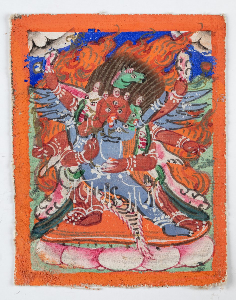 Hajagríva dharmapála yab-yum-os ábrázolásban a megfelelő attribútumokkal.