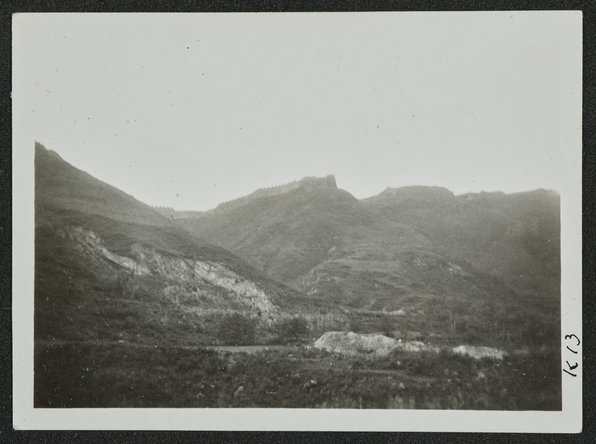 Hegyek gerincén futó Nagy fal, előtte a lekopott sziklák, Nankou-hágó, Peking környéke