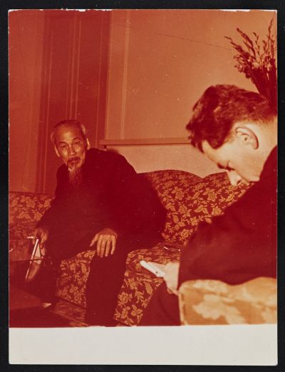A fotón Ho Si Minh virágos mintázatú kanapén ül, jobb kezében égő cigaretta és szemüveg. Egyenesen a kamerába tekint. A kép jobb szélén Patkó Imre jegyzetel. Rév Miklós fotóművész 1959-ben fényképezett Észak-Vietnámban, az akkori Vietnámi Demokratikus Köztársaságban. Patkó Imre újságíróval közös útjáról 1960-ban "Vietnam" címen megjelent kötetükben tudósítottak. Ho Si Minh-nel való találkozásukról számos fotót publikáltak.