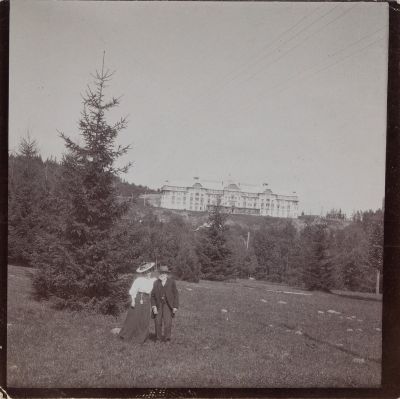 Hopp Ferenc és Móry Helén, háttérben a Móry Szállóval, 1907-ben