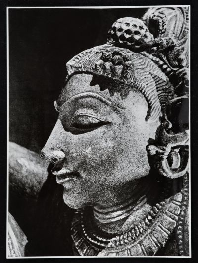 Finoman metszett arcú női alak, a szemöldök vonalát követő íves szemmel, kerek fülbevalóval és széles, többsoros nyaklánccal, díszes kontyba rendezett hajjal. Szobor vagy dombormű részlete.