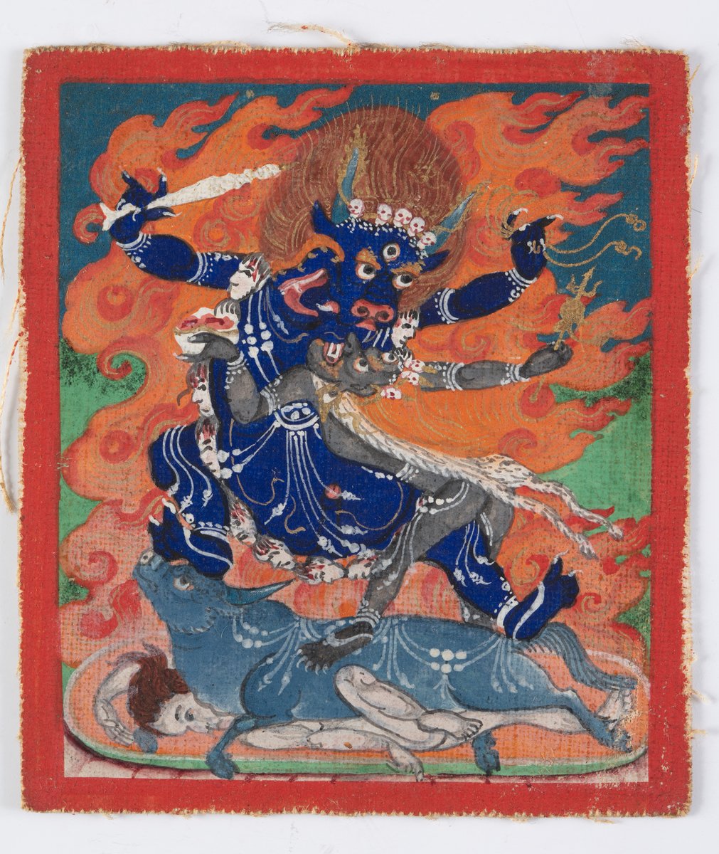 A Tanvédő Jama jobbra lépve egy bikán áll, mely egy női alakon fekszik. Ölében nővére Jámí. Arcuk vicsorgó, vörös hajuk lángként meredezik. Kezükben a megfelelő attribútumok.