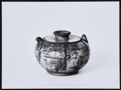 Fekete-fehér fotó: kerámia kiöntő, világosbarna kerámia fehér mázzal, 2002.