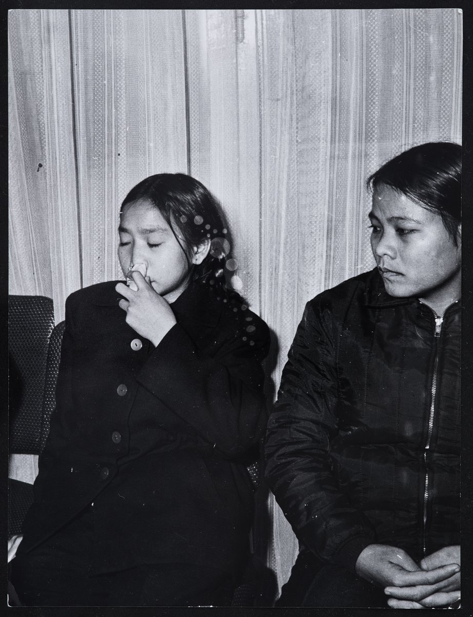 Két fiatal nő sötét kabátban ül, talán irodahelységben. Arcuk háromnegyed profilban látszik, egyikük orrához zsebkendőt tart, másikuk az ölében összekulcsolja kezét. Rév Miklós fotóművész 1959-ben fényképezett Észak-Vietnámban, az akkori Vietnámi Demokratikus Köztársaságban. Patkó Imre újságíróval közös útjáról 1960-ban "Vietnam" címen megjelent kötetükben tudósítottak.