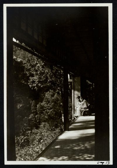 Két pihenő látogató a Dzsingodzsi-kolostor egyik verandáján, Kiotó