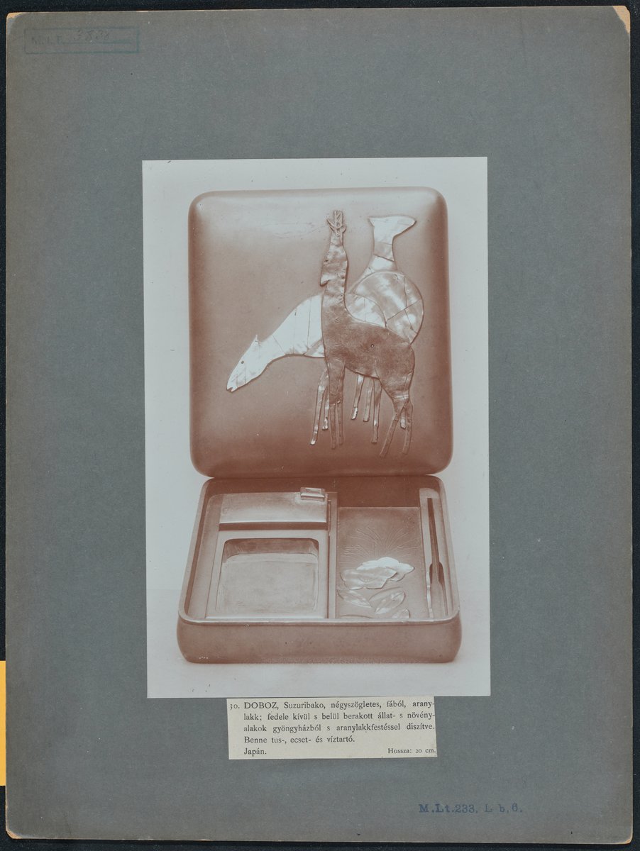 Japán írószeres doboz. Feltámasztott részén őzek gyöngyház berakással. A dobozban dörzskő, víztartó és ecsettartó, virág díszítés.