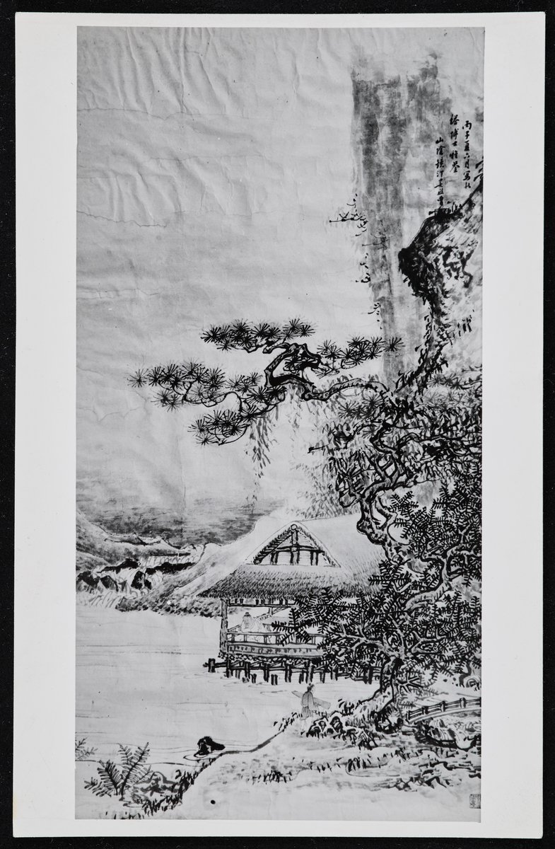 Téli tájkép házzal és emberekkel, a háttérben sziklával, a tekercskép jobb oldal alsó sarkában jelzéssel, a felő részen felirattal.